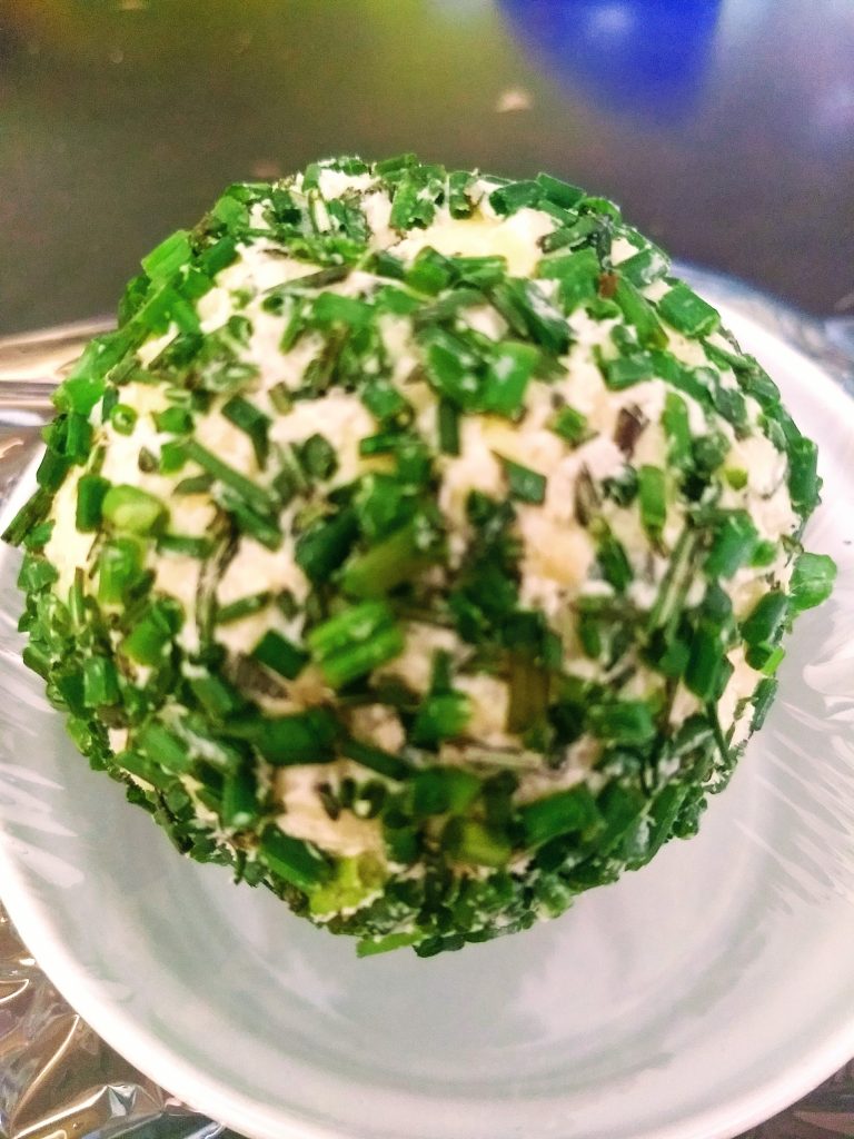 First up….the classic herbed cheese ball. This was a cheese mix of cream cheese, fine shredded gouda and jarlesberg and three herbs….chives, rosemary, and sage and she tossed in some smooshy roasted elephant garlic. Simple and delicious and extremely versatile as a go to cheese ball for the beginning of any meal.