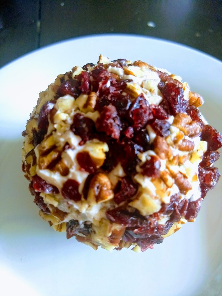 Then there was the dried fruit. I like to keep dried fruit for cheese platters, so why not make a cheese ball? The cheese mix was an even amount each of goat cheese and cream cheese. To that we added chopped dried pears, cherries, and cranberries and then I mixed in a spoonful of quince jam and rolled it in chopped toasted pecans and dried cranberries. It tasted like Fall…warm and not too sweet.