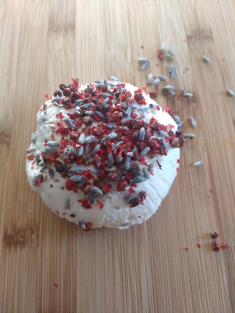 My personal favorite…if I was forced to pick one…was the lavender pepper ball. I mean, it brought a tear to my eye. The cheese mix was goat cheese with a little cream cheese. To that we added a spoonful of meadowfoam honey, some lavender flowers, and some crushed pink peppercorns. And it’s just so pretty to look at. I’ll be making that one a lot. Perhaps weekly. Just for me. And I won’t share it either.