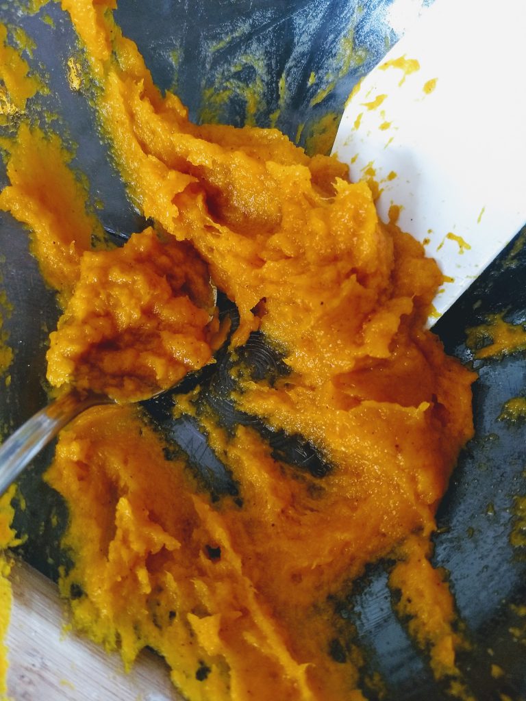 Roast the cleaned, halved, and canola oil coated sugar pumpkin in the oven on 350 cavity sides down for about an hour, or until the flesh is very soft and the edges on the roasting pan have started to carmelize. Let it cool, remove the skin, and sqeeze all the water out through the cheesecloth.