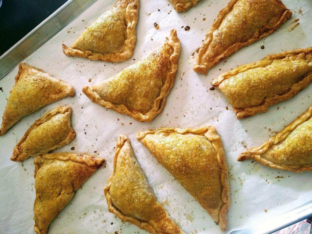 Take one fourth of the pie dough round and fold it over making a triangle, pinching together one side. Holding it in your hand like an ice cream cone, spoon the filling in and pinch the opening closed. Place on a parchment covered cookie sheet, brush with beaten egg, and sprinkle with the sugar mixture.