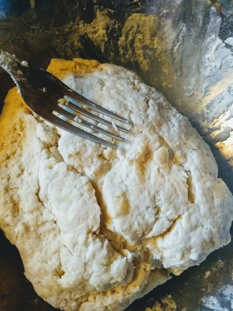 - Pour the butter flour mixture into a bowl and add the buttermilk. I use a fork to bring the dough together, which happens within just a few minutes. Then, use your hands to finish melding the buttermilk and flour mix. Resist the urge to over work it. You just want to flip and knead it until there are no more dry pockets and no more wet pockets. The dough should look craggy.