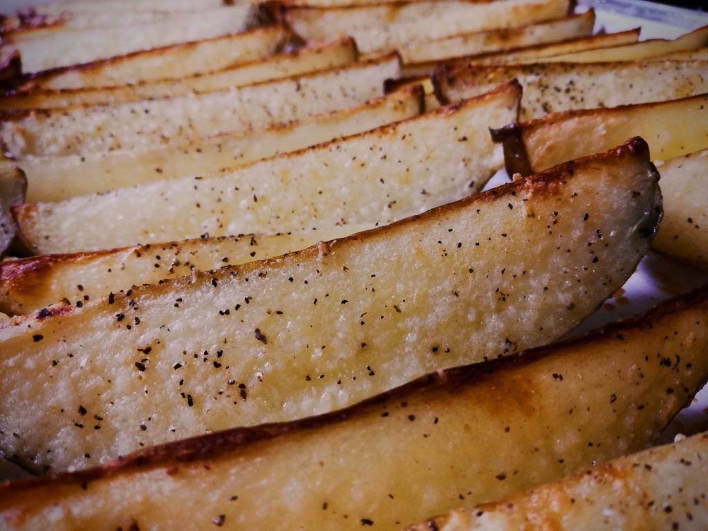 Just cut some cleaned potatoes into wedges and hit them with some oil. I used a canola spray because I’m lazy, but you can also toss them in olive oil. Just don’t saturate them. Then I just salt and pepper them, roast them on 350 until they start to brown. Next, I take them out and sprinkle fine shredded parmesan cheese over them and put them back in the oven to cook the cheese a bit. Before serving them, I drizzle them in truffle oil.
