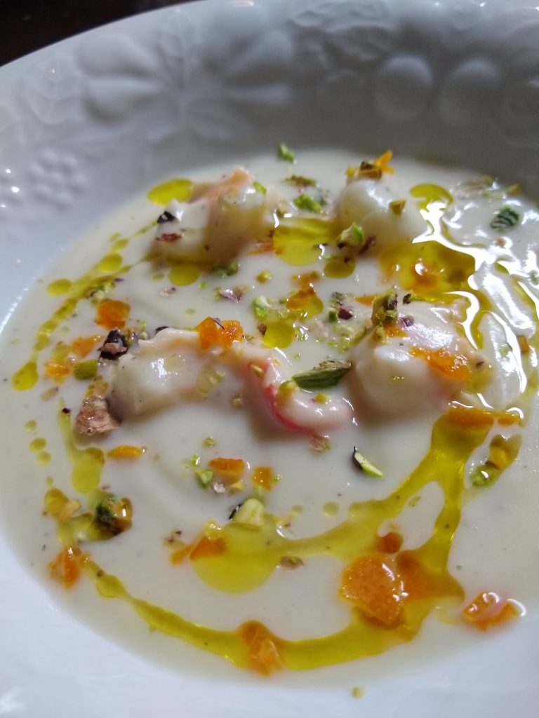 Matthew had to stay home for work, so I invited the Hills and I cooked like my life depended on it since the Killikellys won’t be coming for Friends Giving this year. (booooooo hisssssss) First up was the cauliflower prawn soup. I know, right?! Never have I looked at a cauliflower and thought, “Mmmm, soup.” I made some candied orange peel confit (so it was already weird), chopped some pistachios, and blended some vanilla Jim Beam into some olive oil. What?! Yes. The soup was divine and I’ll be making it a million times again.