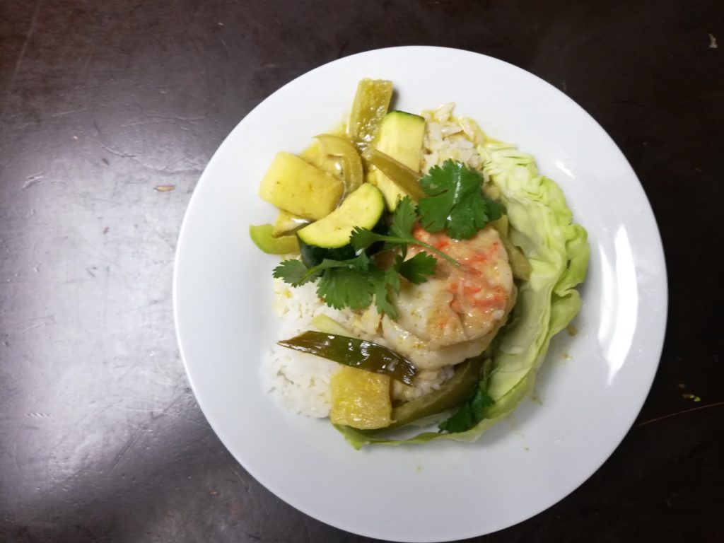 When that was gone, I finished up with Thai green curry prawns over jasmine rice. My fishmonger turned me on to these monster prawns when I couldn’t find langostinos. They worked well because I used them in the soup and the curry and no one was mad about it. I opted for fresh pineapple in the curry and garnished it with raw green cabbage. I find the cabbage cools down the spicy heat of the curry. I also tossed in some zucchini, green onions, and green bell peppers. Everyone’s mouths were on fire, but we powered through it!