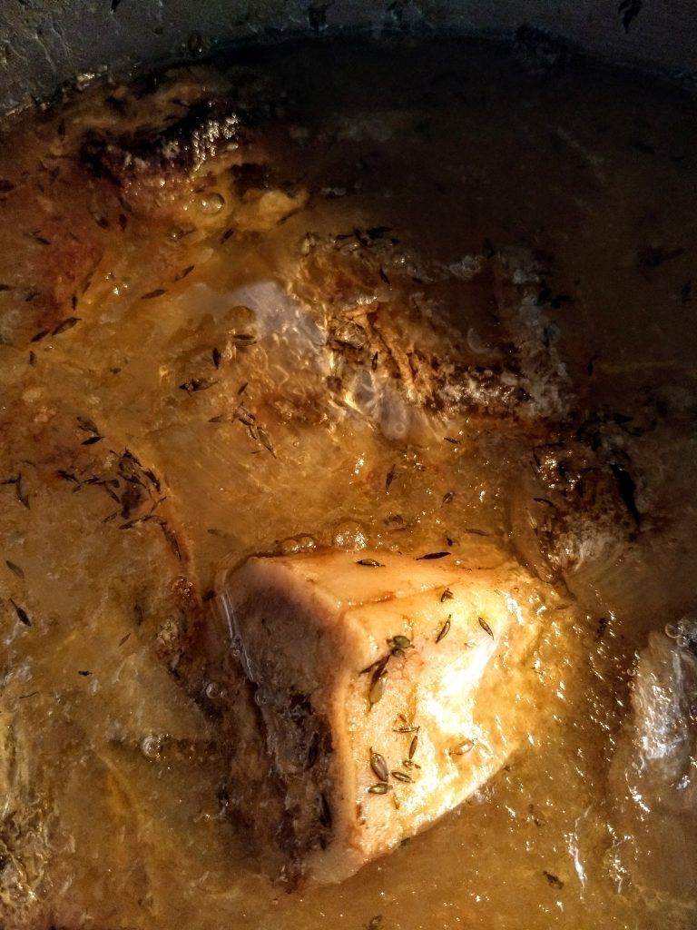 - With tongs, move the bones to a stock pot and cover with water. Add fresh thyme sprigs and a whole trimmed onion. Cover with a lid and cook on low for three days, turning it off and storing in the fridge at night. Add back water as needed.