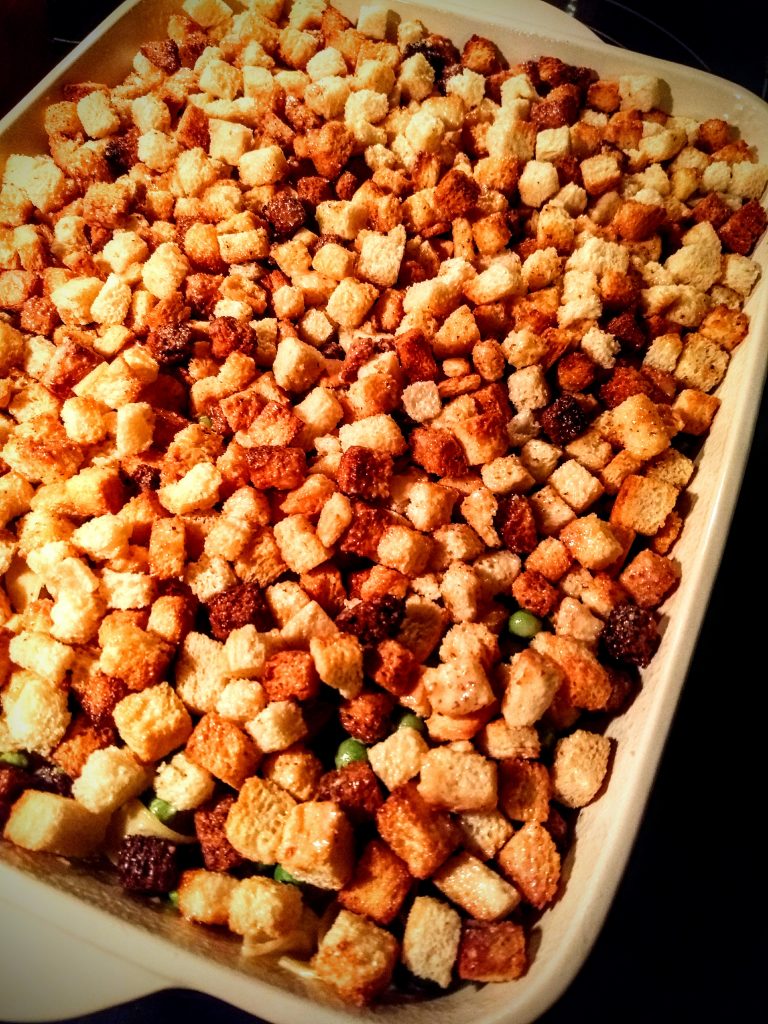 - Press the buttered bread cubes over the top of the casserole and bake for about 20 to 30 minutes or until the bread cubes are crispy. And voila!
