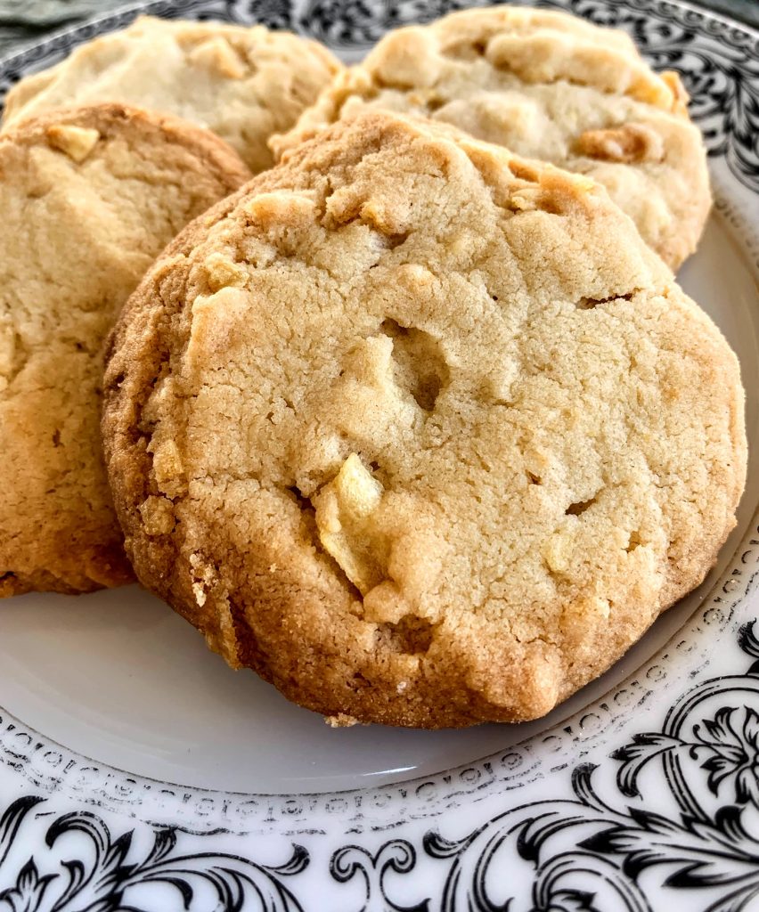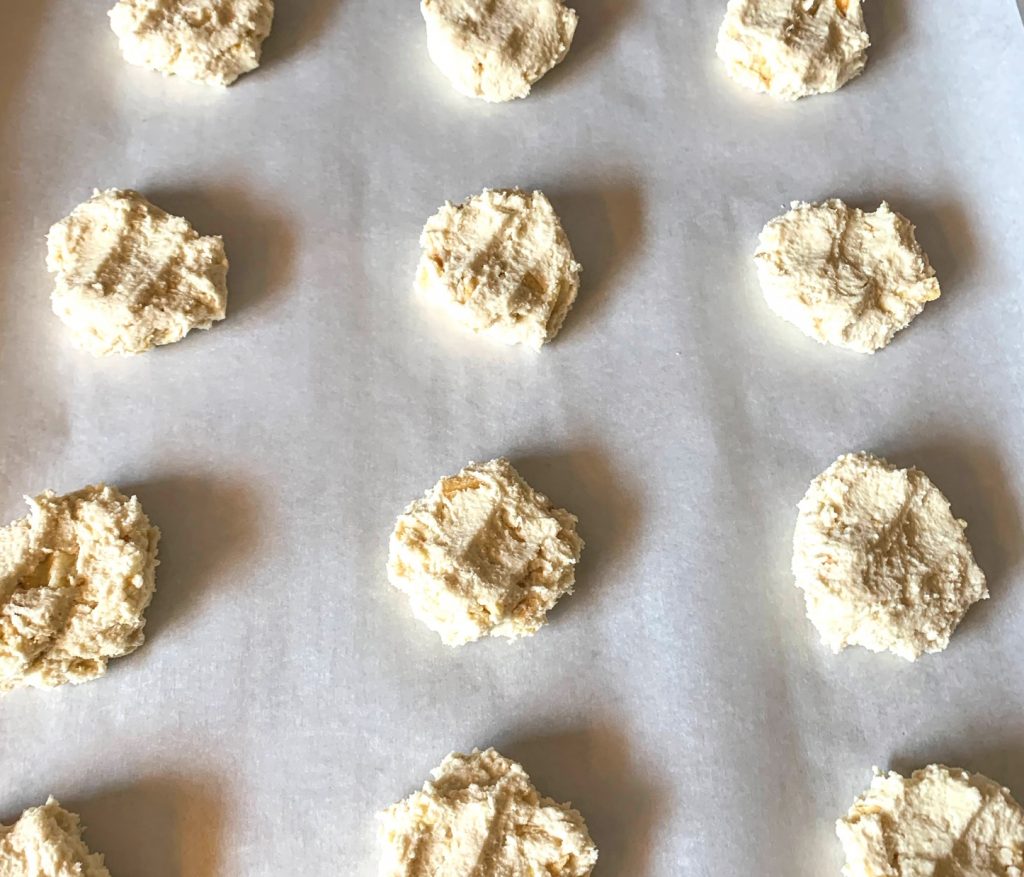 - On a baking sheet lined with parchment paper, drop tablespoon sized dollops of dough, flatten slightly, and bake for about 10-15 minutes or until the edges are golden and lightly browned.